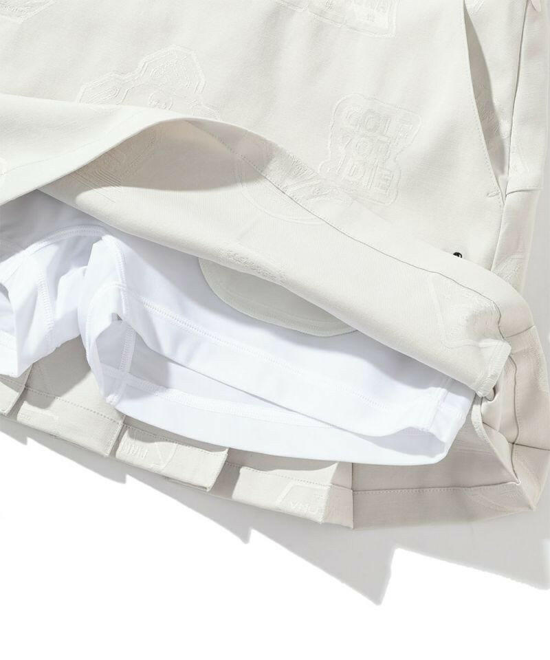 バックパネルのプリーツの上部を切り替えることで、腰まわりが体にフィットし、全体が広がりすぎないシルエットに設定されています。オリジナルワッペンデザインを緻密にジャカードで表現。ストレッチ性があり、ノンストレスでプレーに集中していただけます。左脇ファスナー開きになっており、ウエストにはゴムインベルを使用。耐久性、寸法安定性、着心地のよさを追求しました。ミニ丈でも安心なインナーパンツ付き。