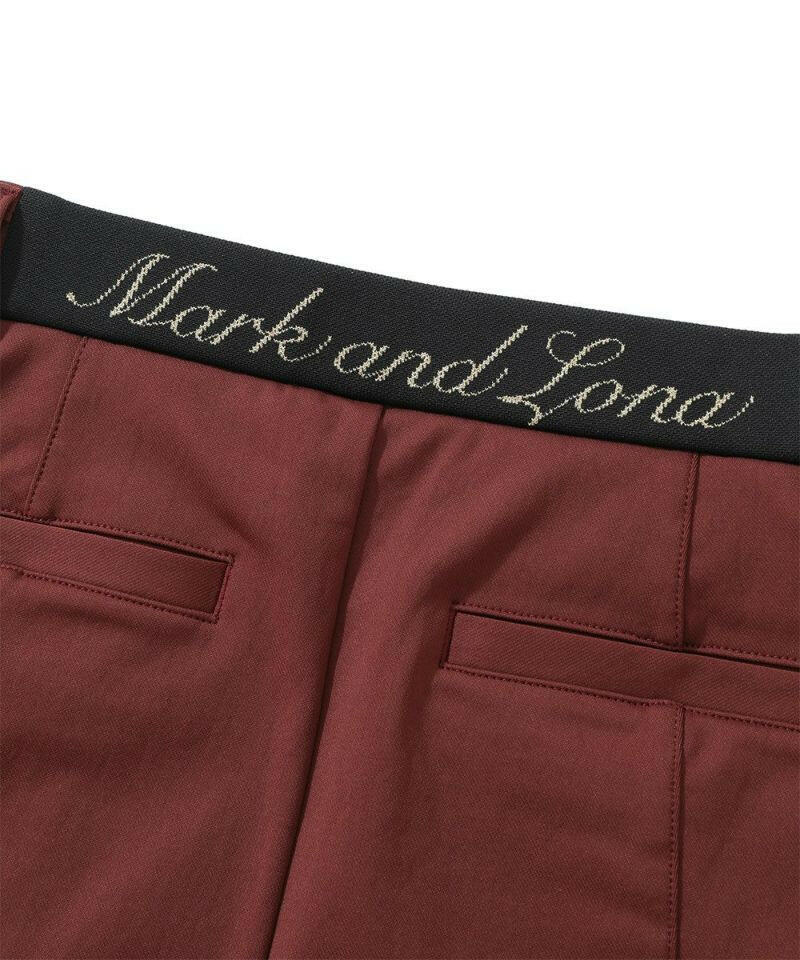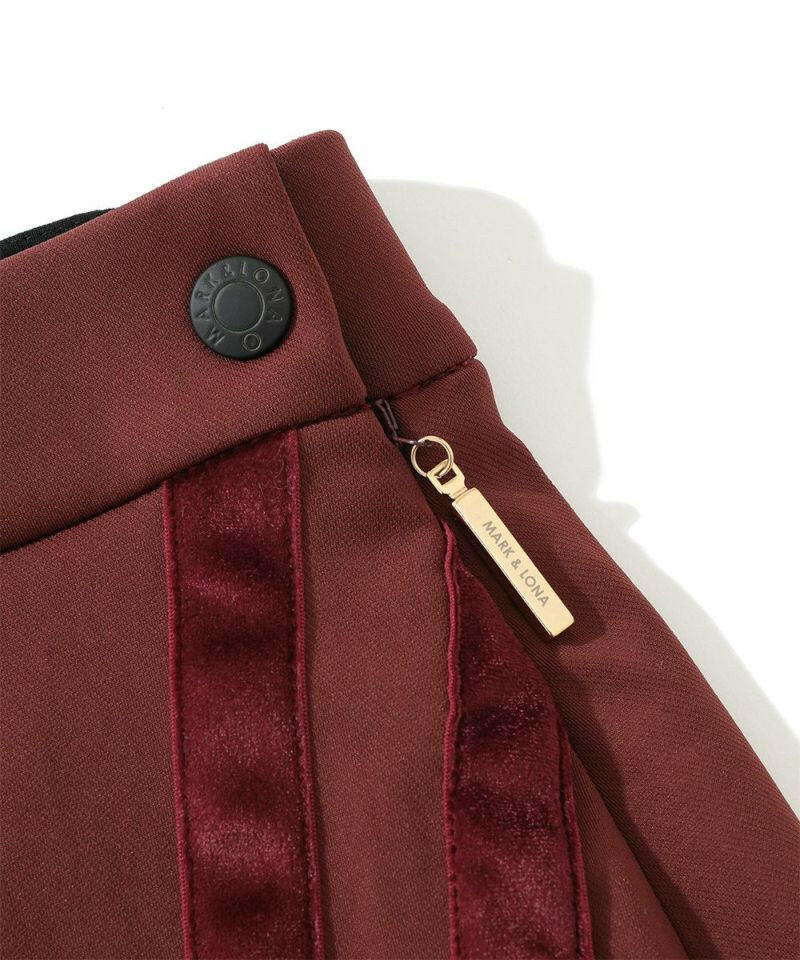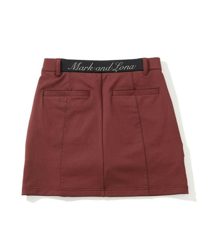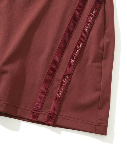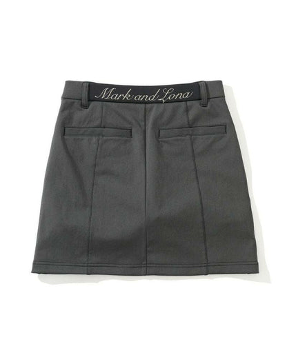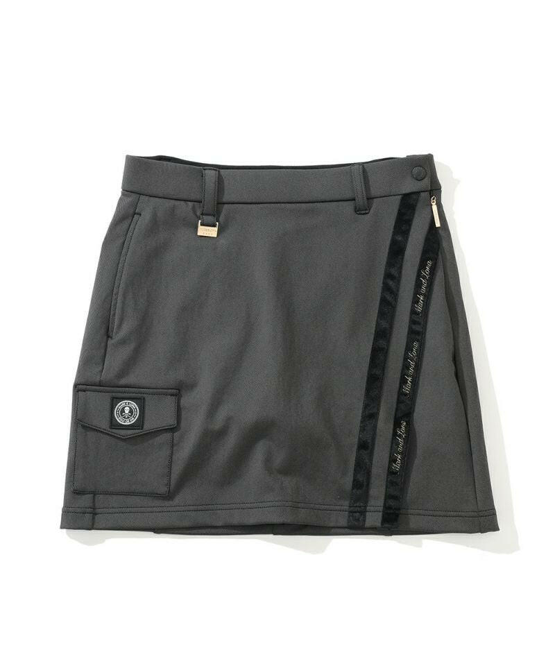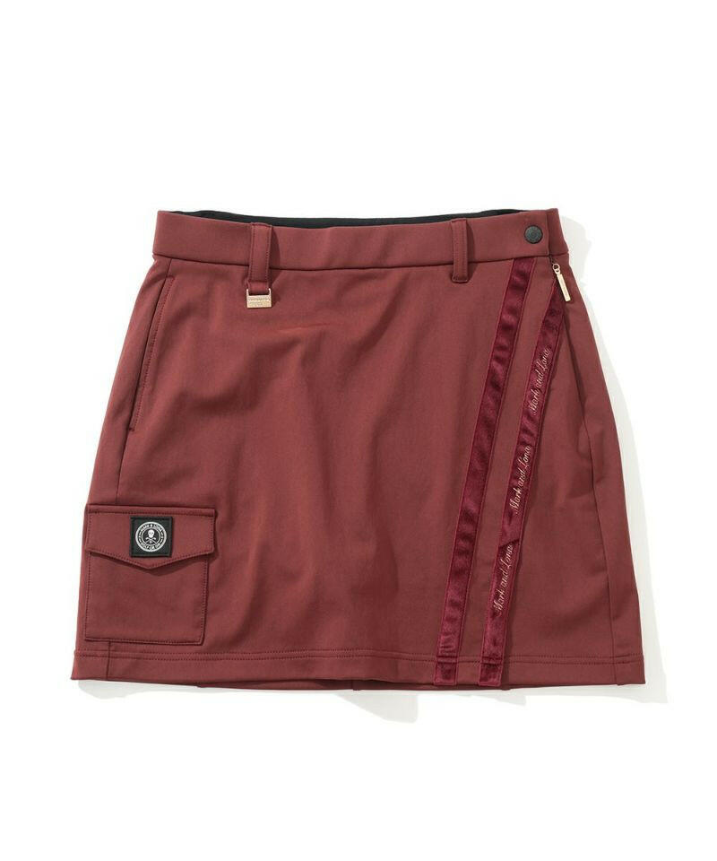 ハイストレッチな素材特性を活かしたタイトスカート。右脇ポケットにサークルスカルデザインの織りネームワッペン、後ろベルトに筆記体ロゴをニットジャガードで表現、フロントのベロアテープに筆記体ロゴの刺繍、脇にロゴ刻印入りラバータッチプランサーボタン、右前ベルトループにロゴ刻印入りのミニチャームをあしらいました。