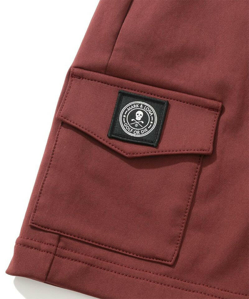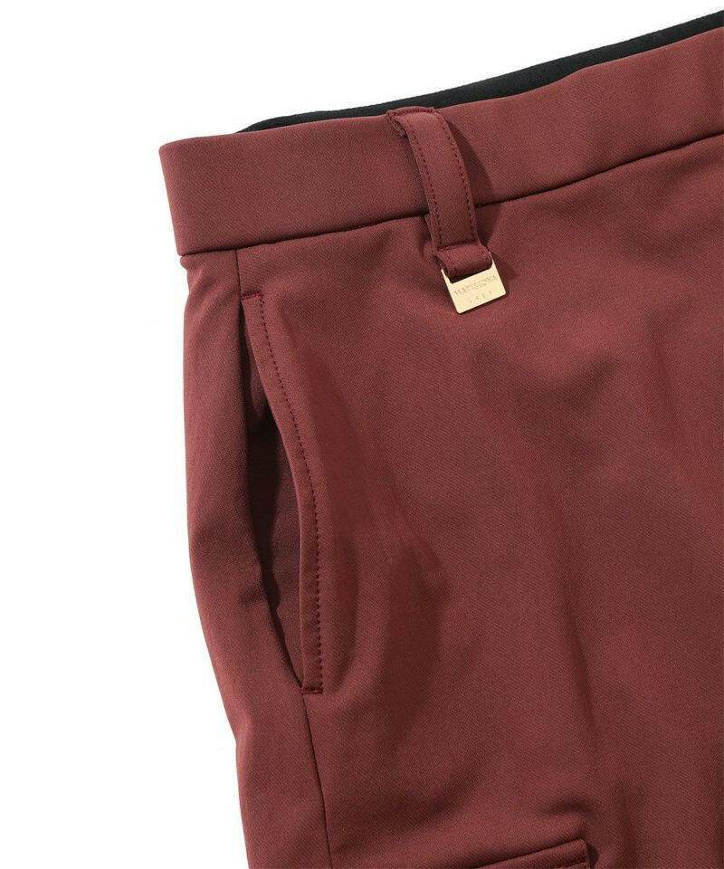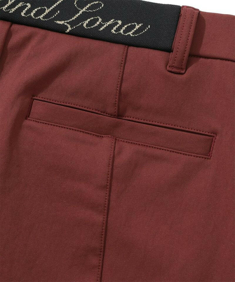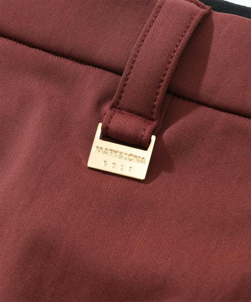 ハイストレッチな素材特性を活かしたタイトスカート。右脇ポケットにサークルスカルデザインの織りネームワッペン、後ろベルトに筆記体ロゴをニットジャガードで表現、フロントのベロアテープに筆記体ロゴの刺繍、脇にロゴ刻印入りラバータッチプランサーボタン、右前ベルトループにロゴ刻印入りのミニチャームをあしらいました。