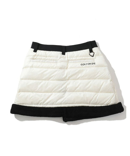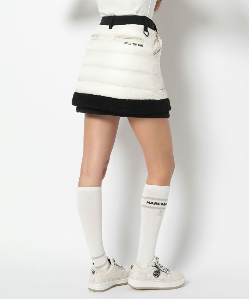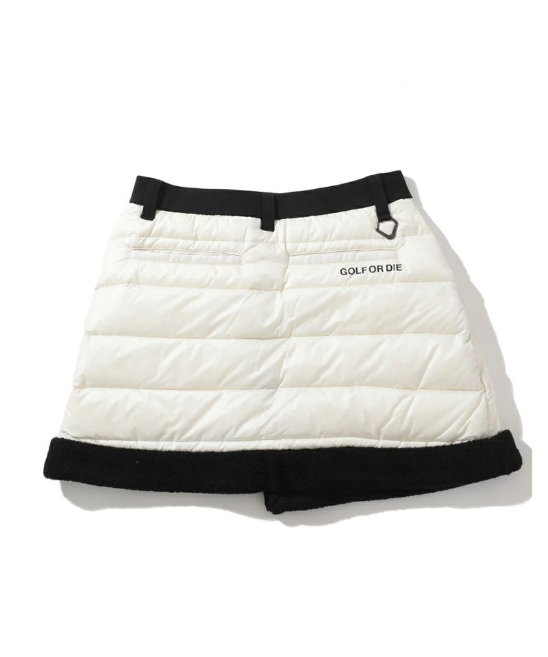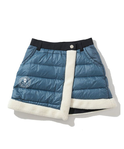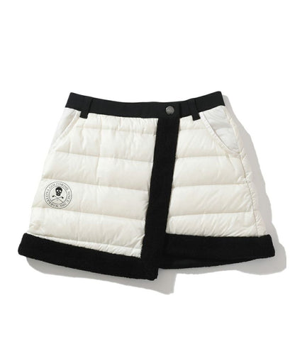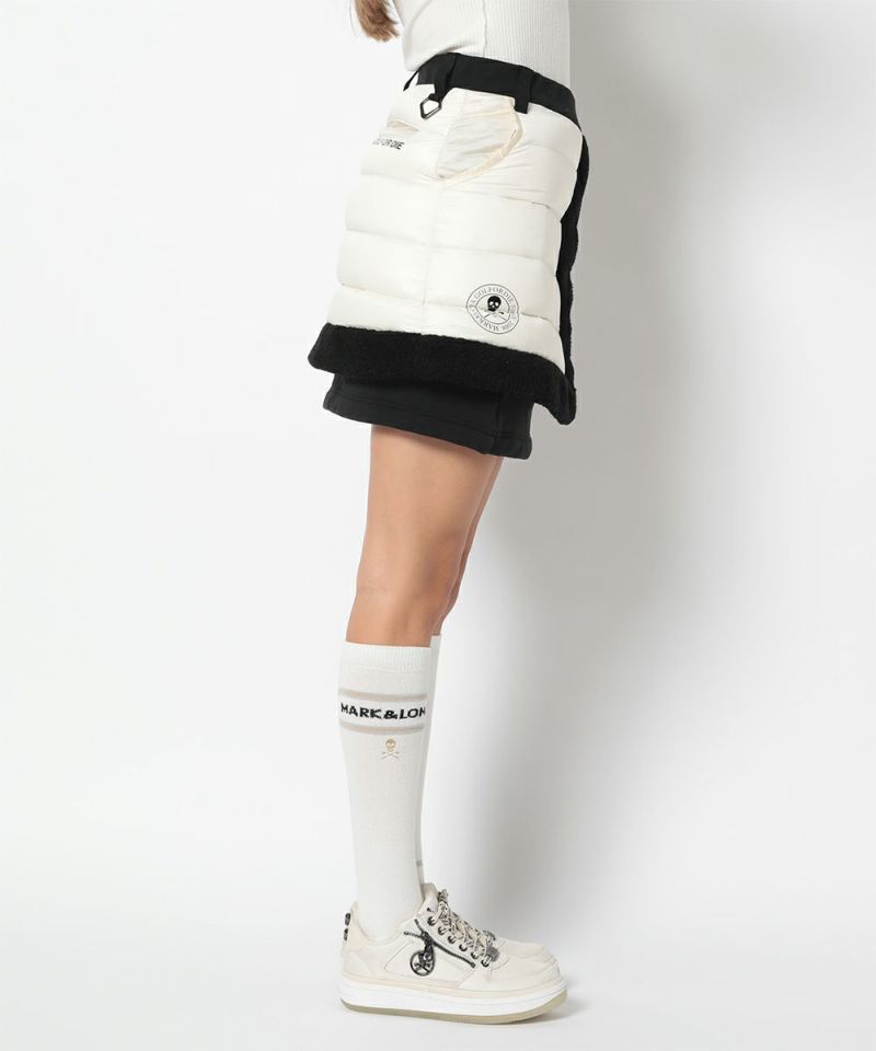 ボア付きダウンハイブリッドスカート。タイトスカートにダウンスカートが重なったハイブリッドタイプ。オーバースカートは光沢感のある高密度ナイロンタフタの二層素材に700フィルパワーの高品質ダックダウン入りで抜群の暖かさをキープ。トリミングにはボアをドッキング。アンダースカートはベロアのような裏起毛が特徴で保温性の高いカットソーを使用。ウエストのリブには遠赤外線を放射する特殊セラミックを練り込んだ糸を使用し、温かさをサポート。またスピンドルでシルエットの調整が可能。