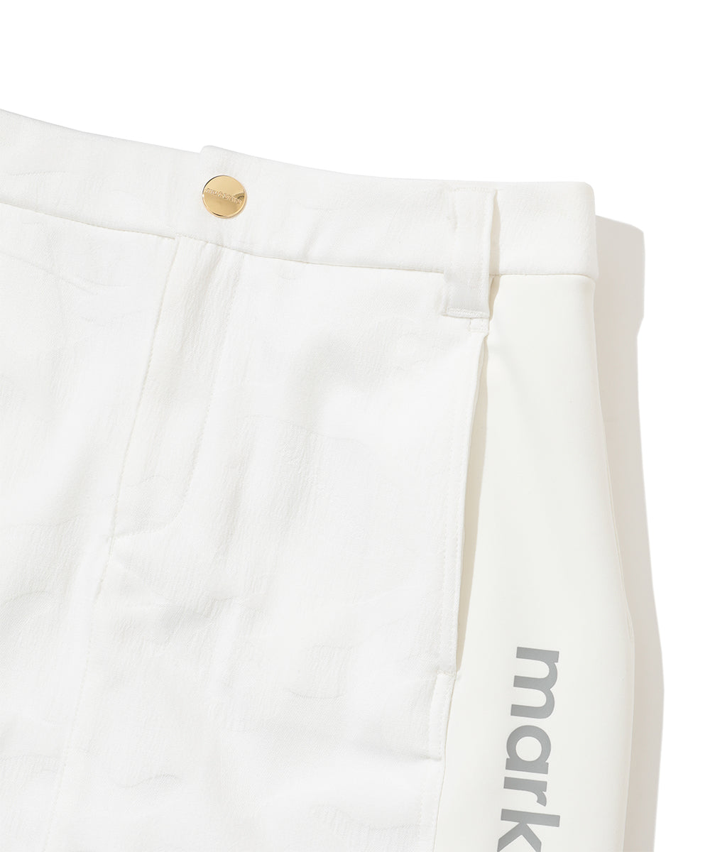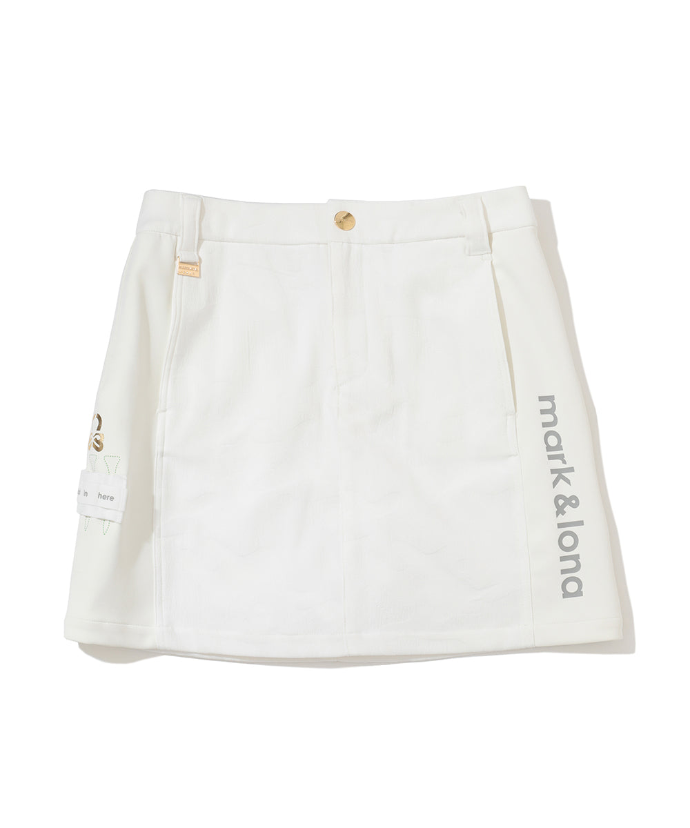 カモフラージュパターンのストレッチジャカード素材とダンボールニットのコンビネーションスカート。上品な光沢感と適度なストレッチ性を兼ね備えた季節を問わず活躍する万能アイテム。