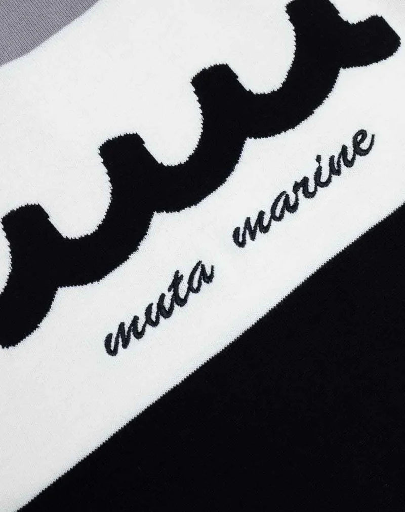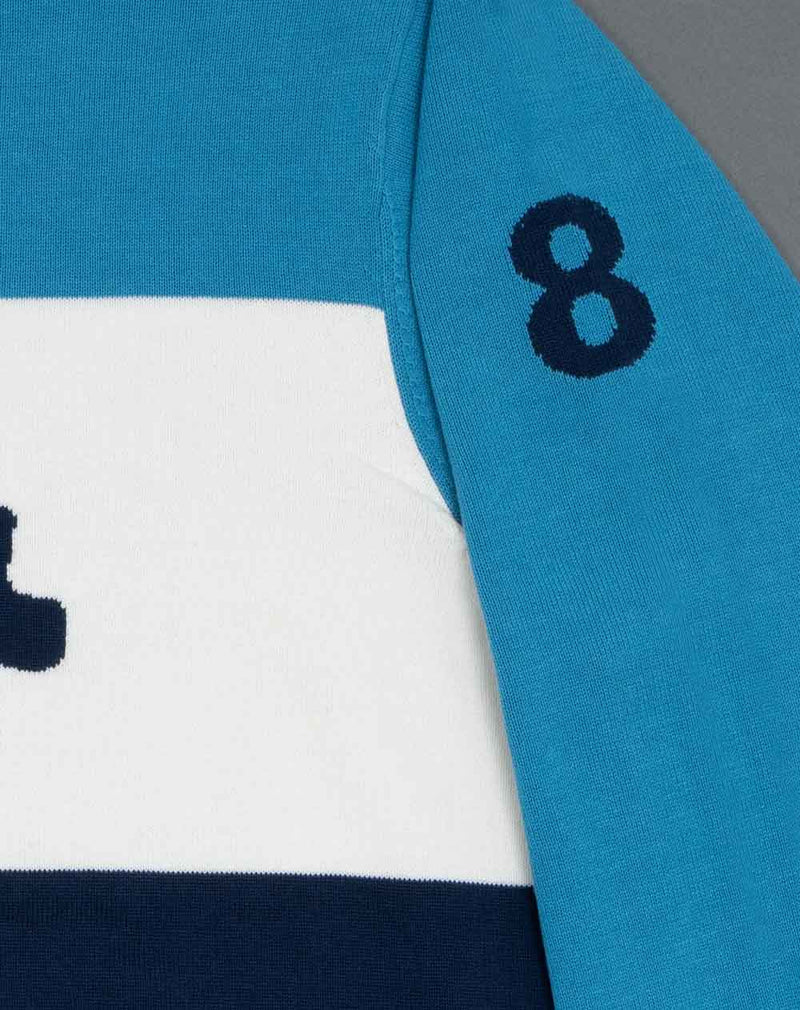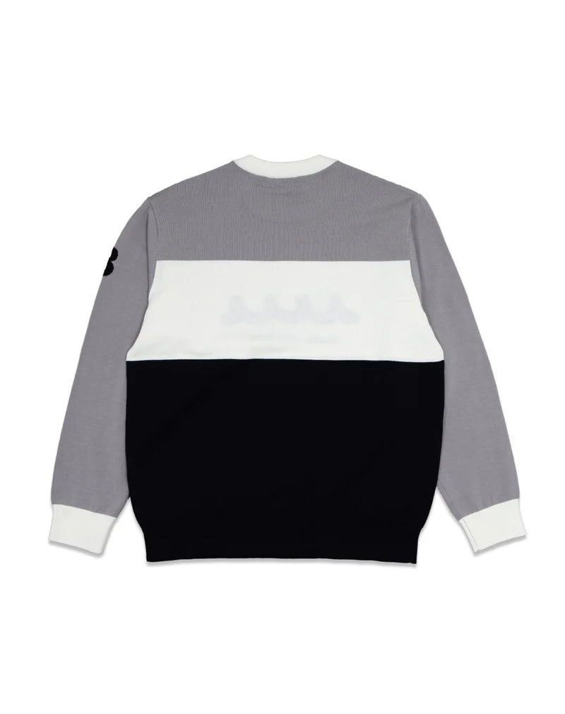 インターシャ編みで凹凸が無くフラットな編地に仕上げ、大胆なカラー配色が特徴的なデザイン。
