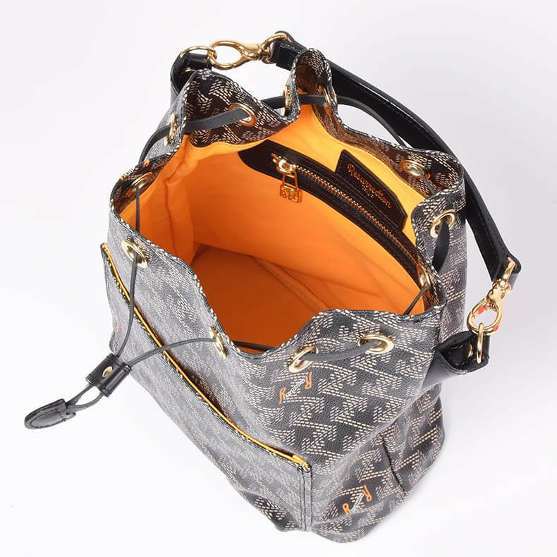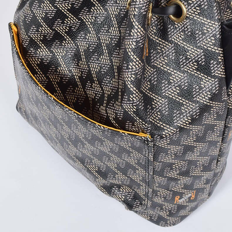 開け口はガバっと大きく開くので、どこに何が入っているのかすぐに分かります。内生地に黄色のファブリックを使用しているのでバッグ内も明るく視認性もバツグン。