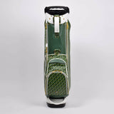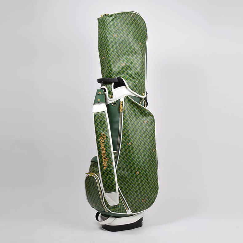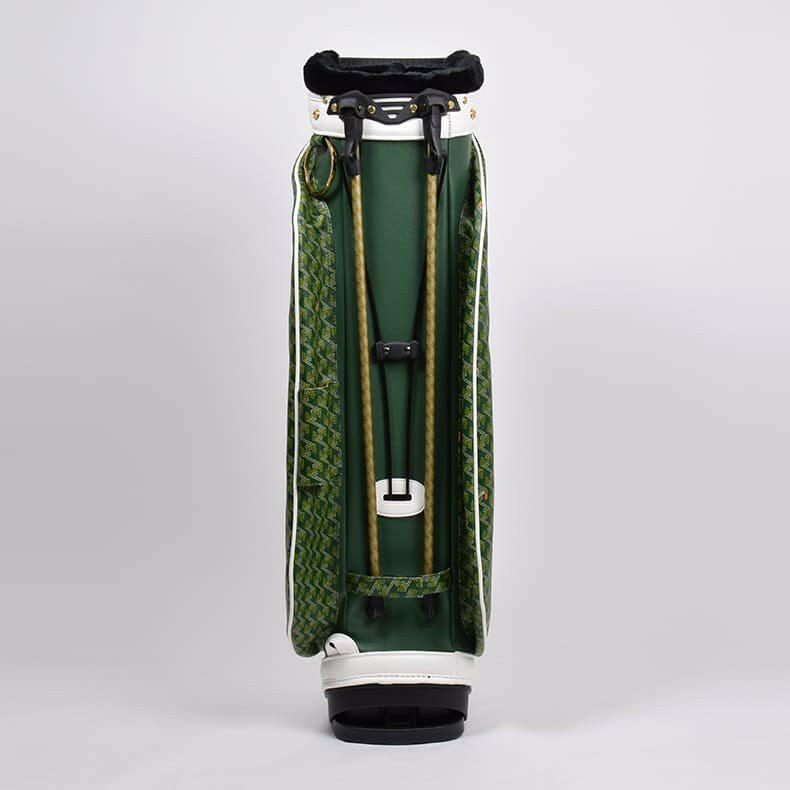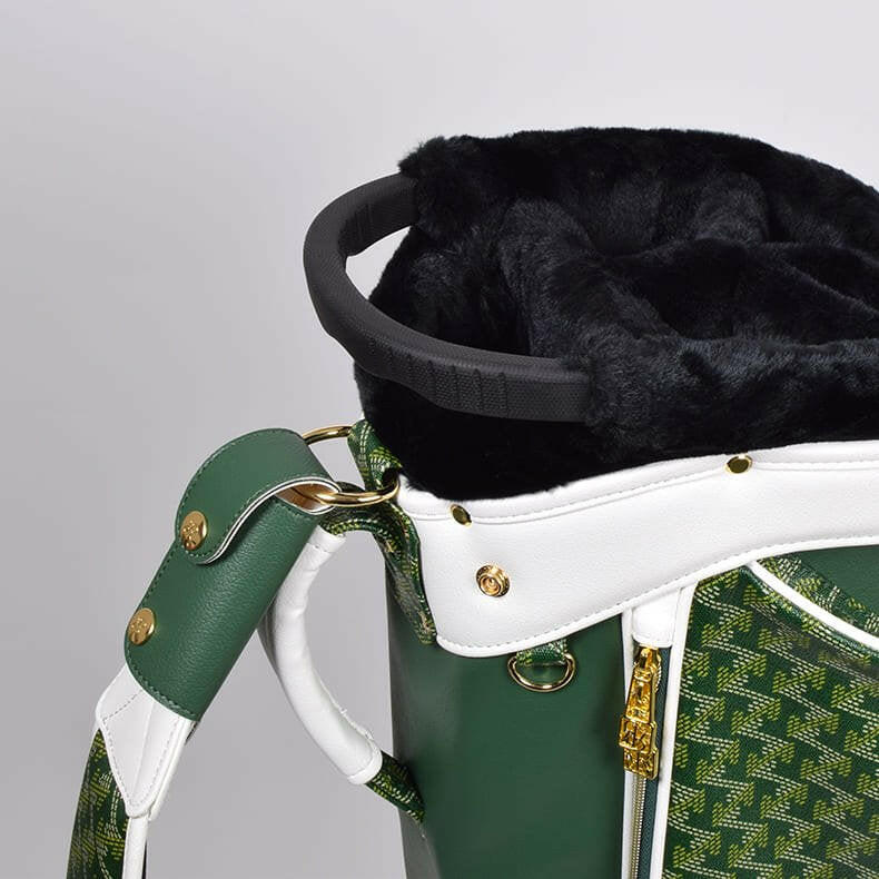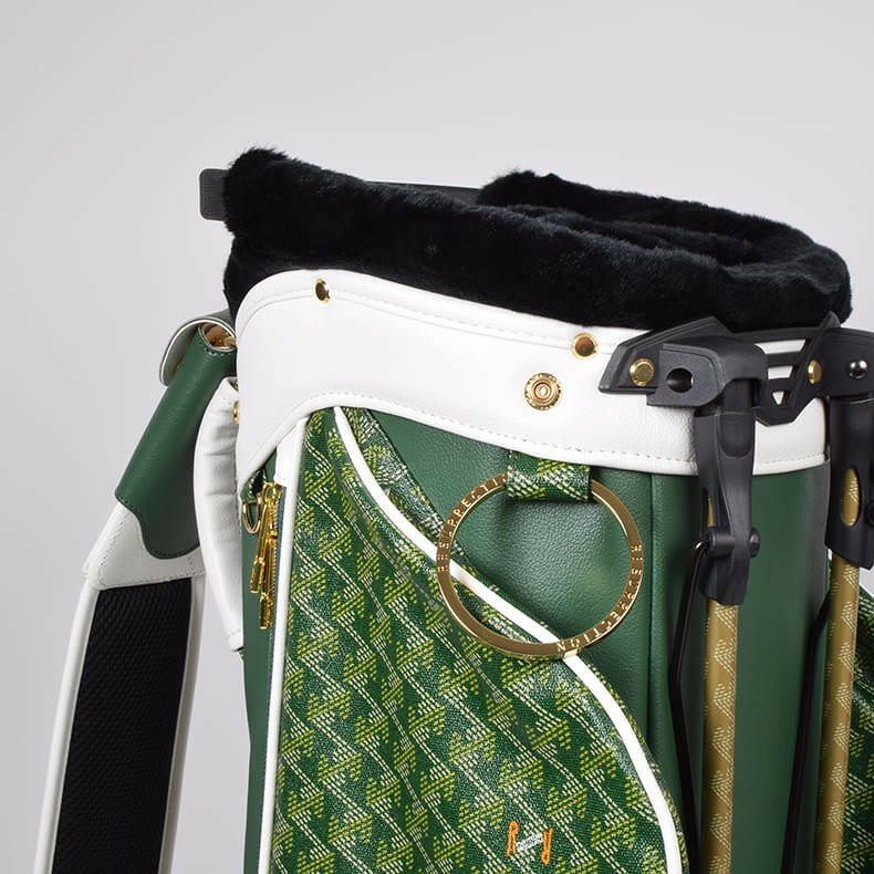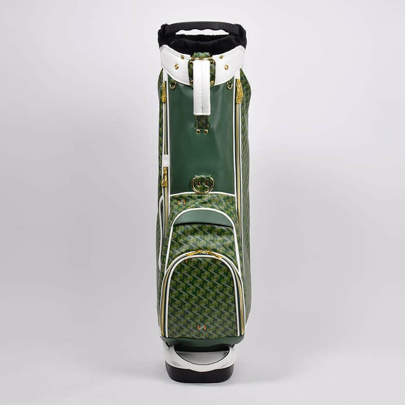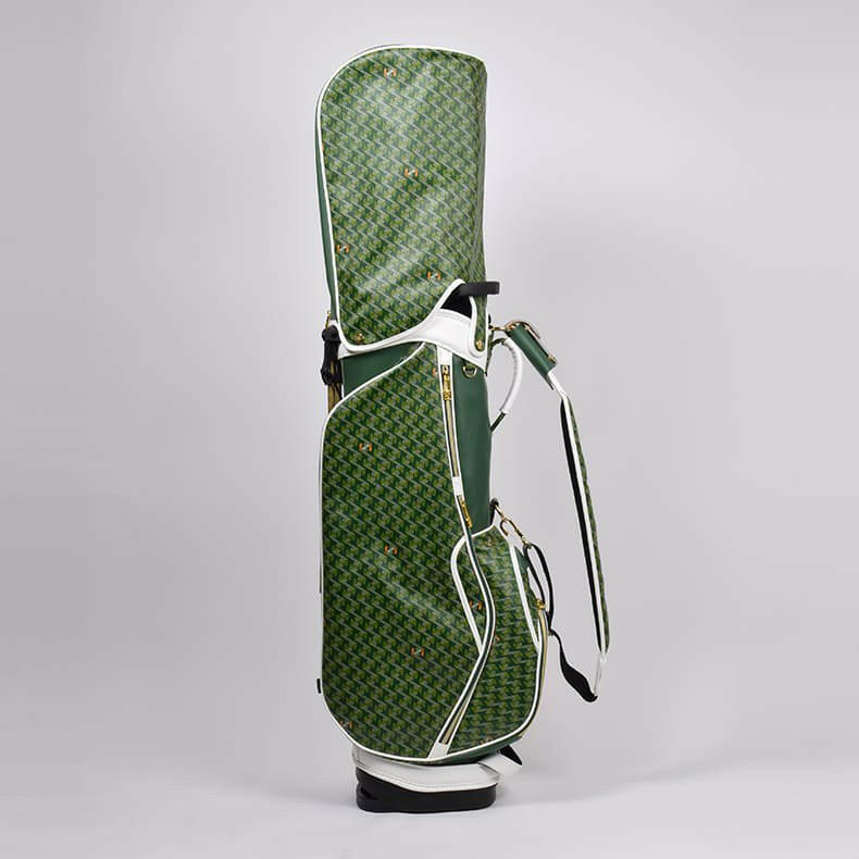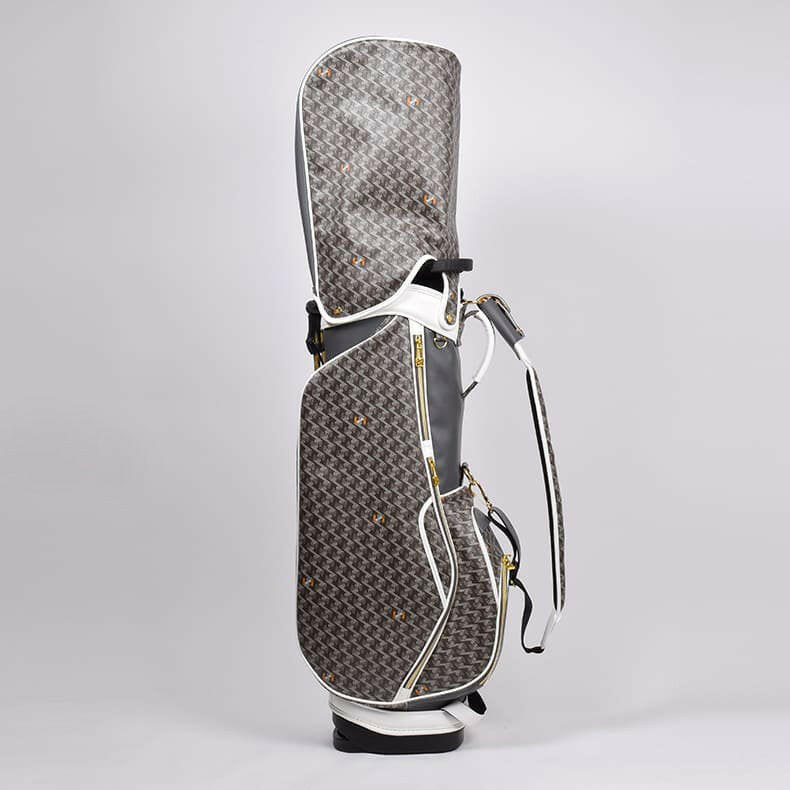 前作までは側面にクッション素材をあしらったスタンド型キャディバッグらしいデザインになっておりましたが、今回は側面すべてを幾何学模様の入ったPVC生地にチェンジ。ガラッとイメージの変わったラグジュアリー感のある雰囲気に。