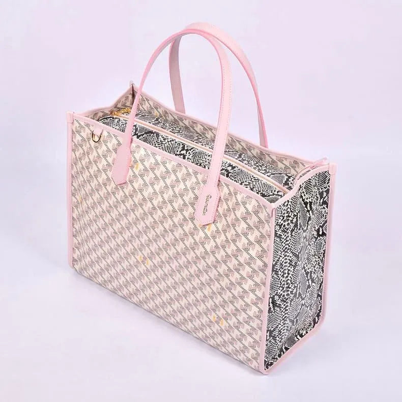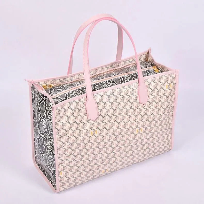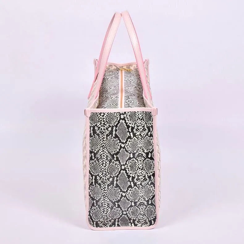 側面や開口部にあしらわれたパイソン柄がラグジュアリーな存在感を放ち、光沢感のあるレザレクション生地が洗練された艶感を演出。シンプルなコーディネートも、これ一つで華やかに仕上がります。