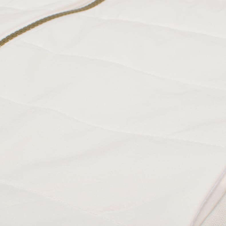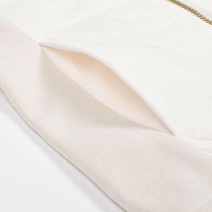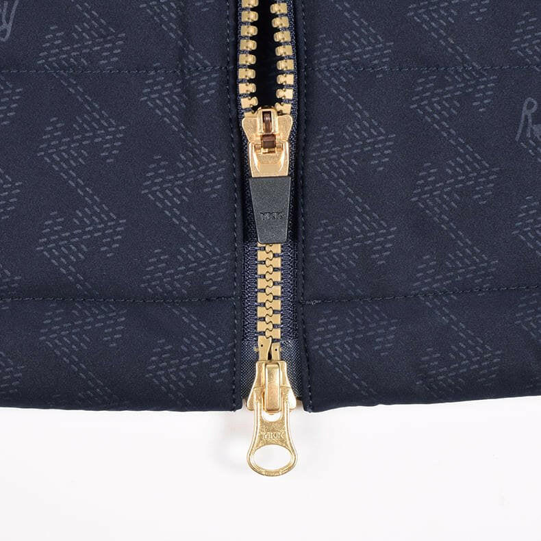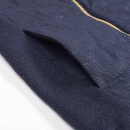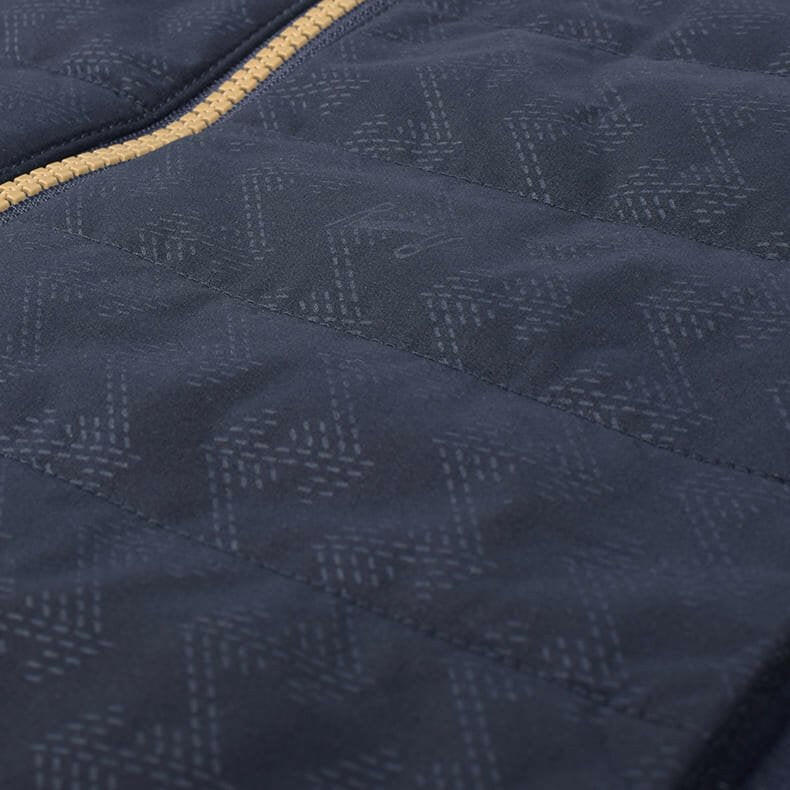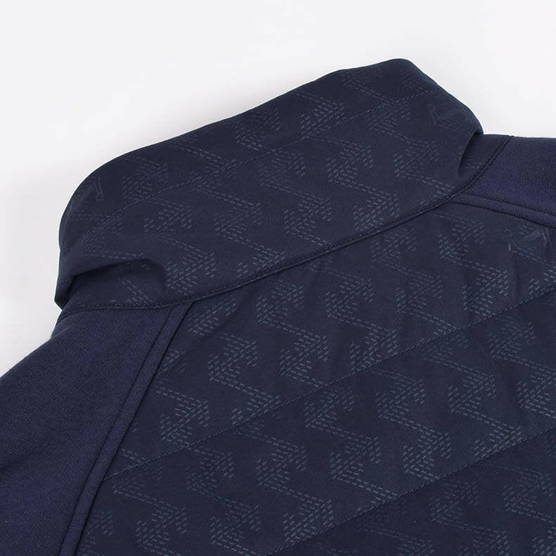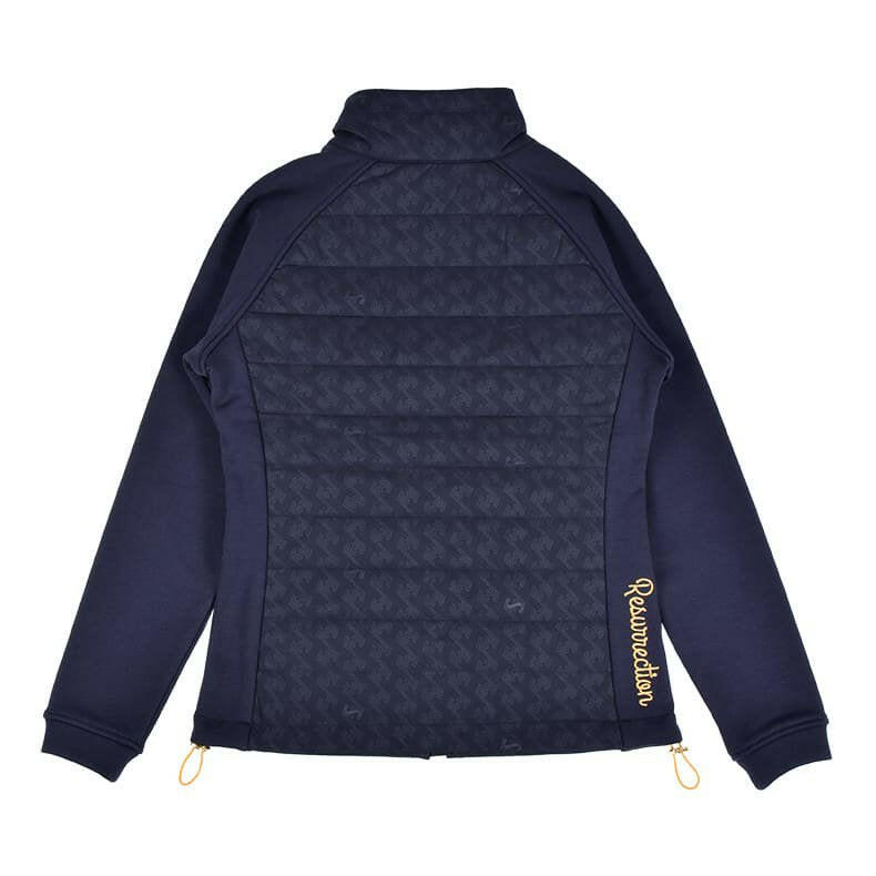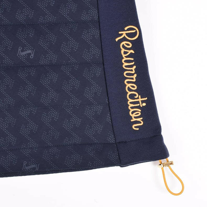一見シンプルな見た目ですが、実は全体に幾何学模様をあしらったレザレクションらしいデザイン。幾何学模様は生地の動きや光のあたりかたによって、キラッとさりげなく柄が浮き上がるエンボス加工を採用しているんです。オススメしたいのが同時発売の『ウォームパデットロングパンツ』とのセットアップ。素材の切り返しや、随所に入るロゴ刺繍などセットアップならではの統一感は、着用するだけでワクワクとした気持ちになります。