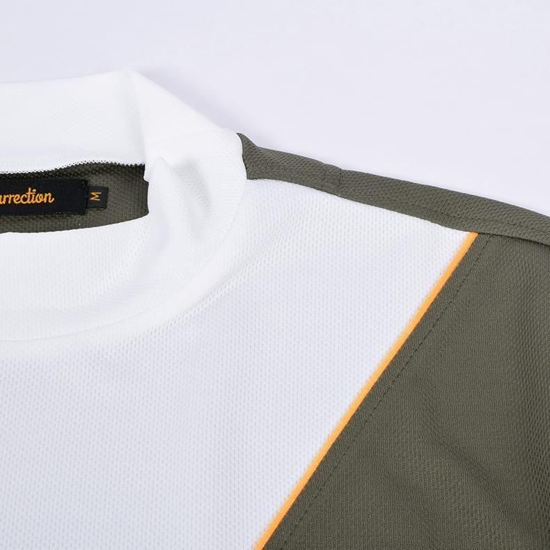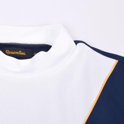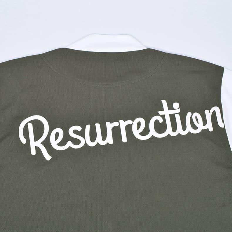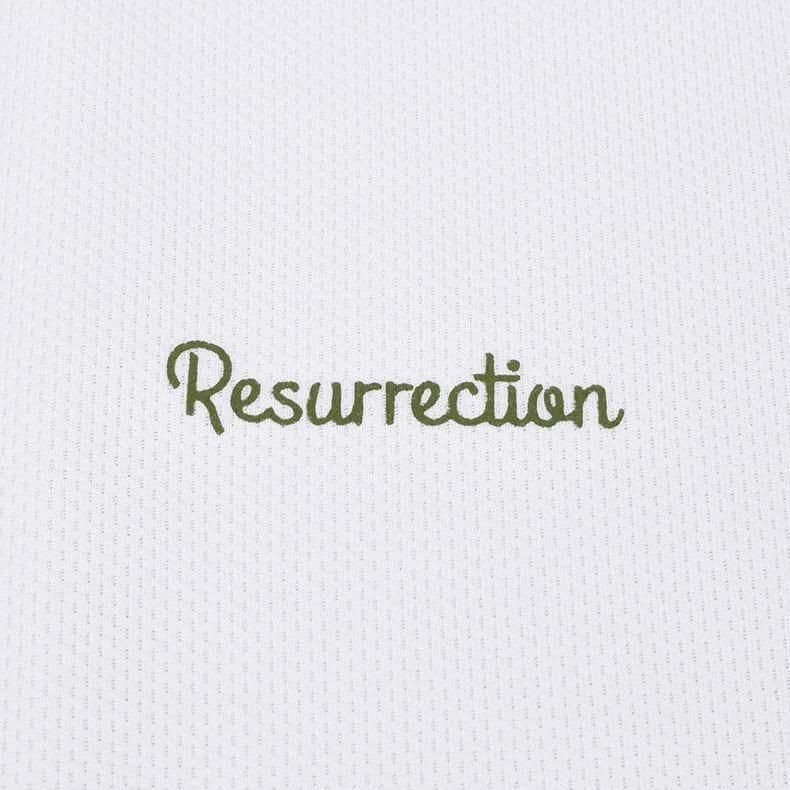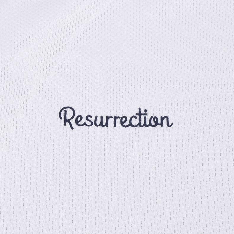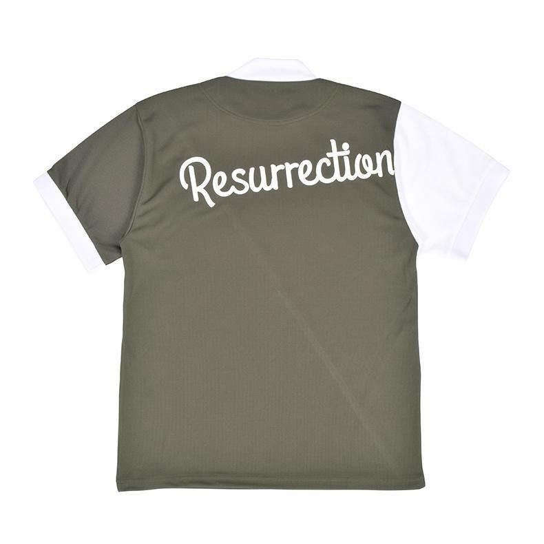 バックには象徴的な「Resurrection」ロゴが大きくプリントされ、存在感を放ちます。吸水速乾性に優れたポリエステル100%素材で、ストレッチ性も高く、スイング時の動きにもスマートに対応してくれます。