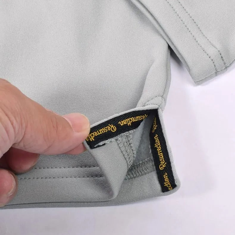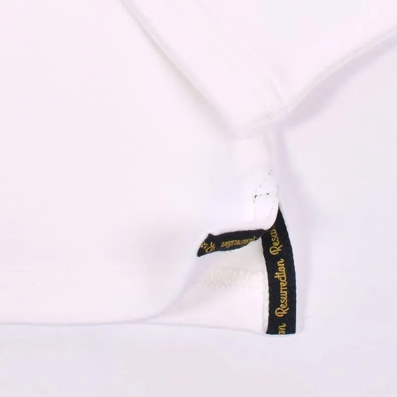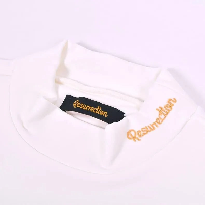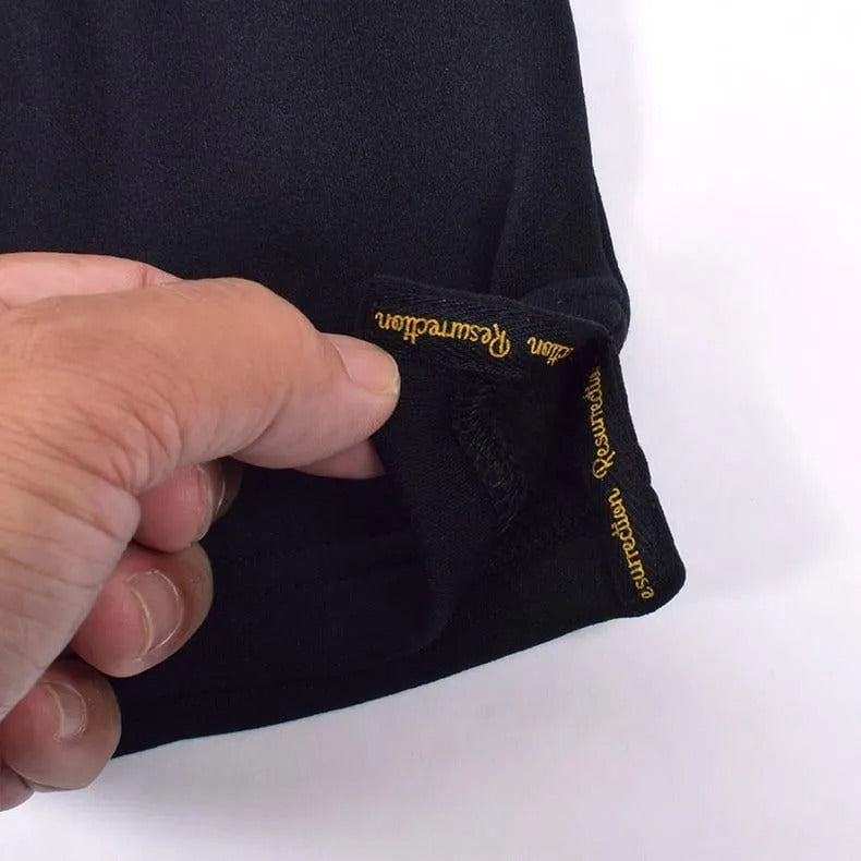 首元にはレザレクションのロゴ刺繍をさりげなく配置し、レイヤードスタイルでも上品に映えるデザインアクセントに。シンプルながらも洗練された印象を与える、機能美とデザイン性を兼ね備えた一枚です。