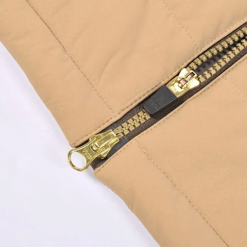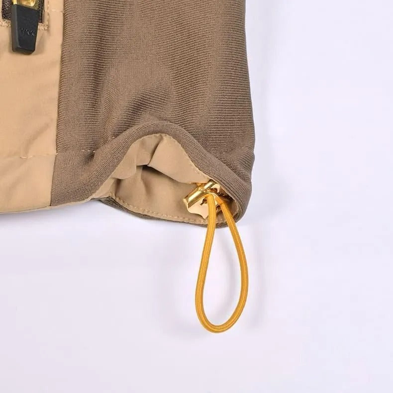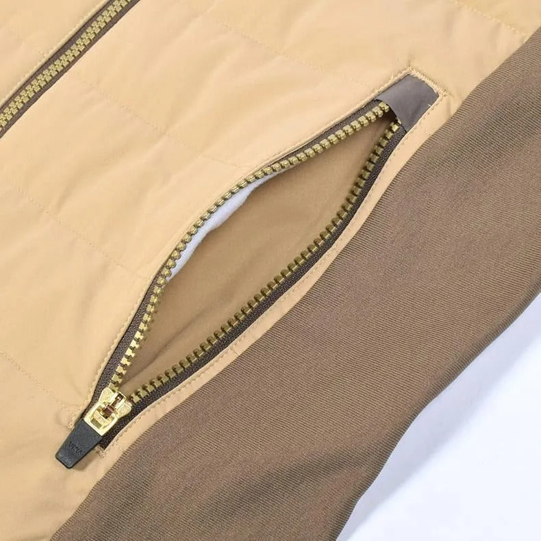 前身頃にはキルティングの中綿素材、サイドにはストレッチ性のある生地を使用した異素材の2トーンデザインが立体感を生み、どの角度から見ても洗練された印象に。ファスナーやロゴテープにあしらったゴールドパーツが、さりげなく上品さを添えます。