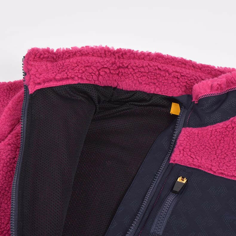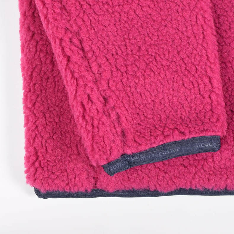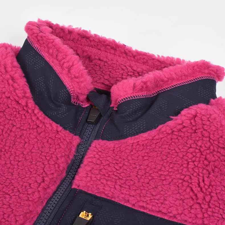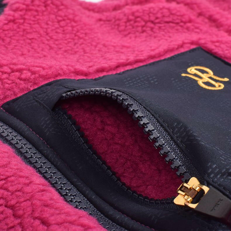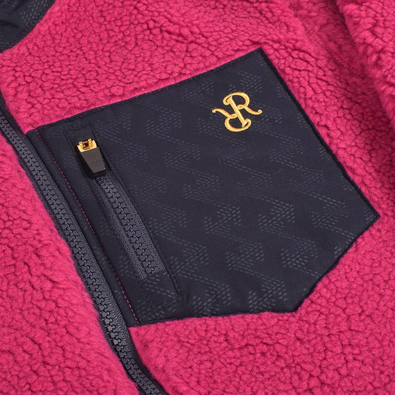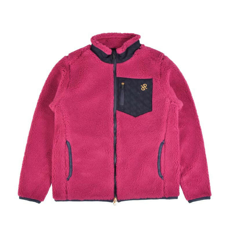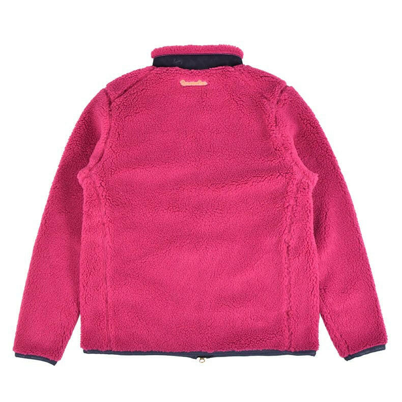 ボアジャケットにアウトドアライクなニュアンスをプラスするのが、ちょっとした小物を入れるのに便利な胸ポケット。そして、ネック部分の切り返しのデザインも、ちょつしたデザインですが大事な要素。着るたびに見つかる細部のデザインもポイント。ネック部分や胸ポケットには、光の当たる角度によってレザレクション柄がキラッと浮き出るエンボス加工の生地を使用。袖口や裾部分のパイピングには、ブランドロゴが型押しされたテープを使用し、ふとした瞬間に気づくロゴデザインに気分も上がります。