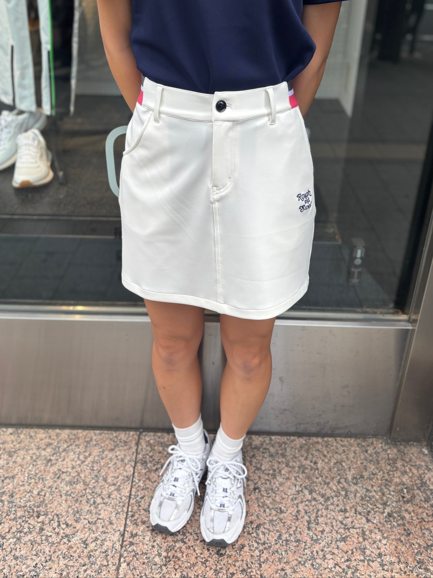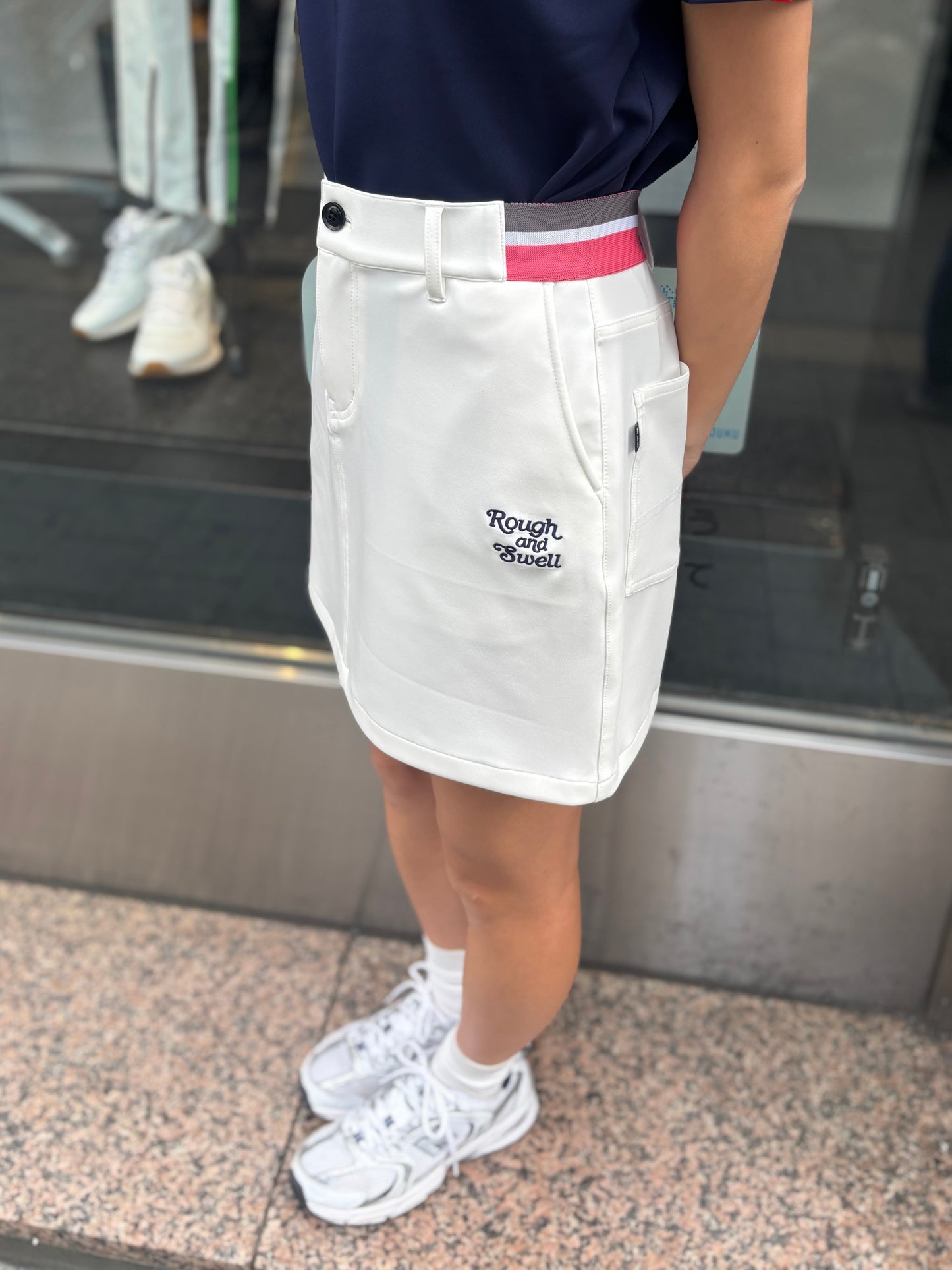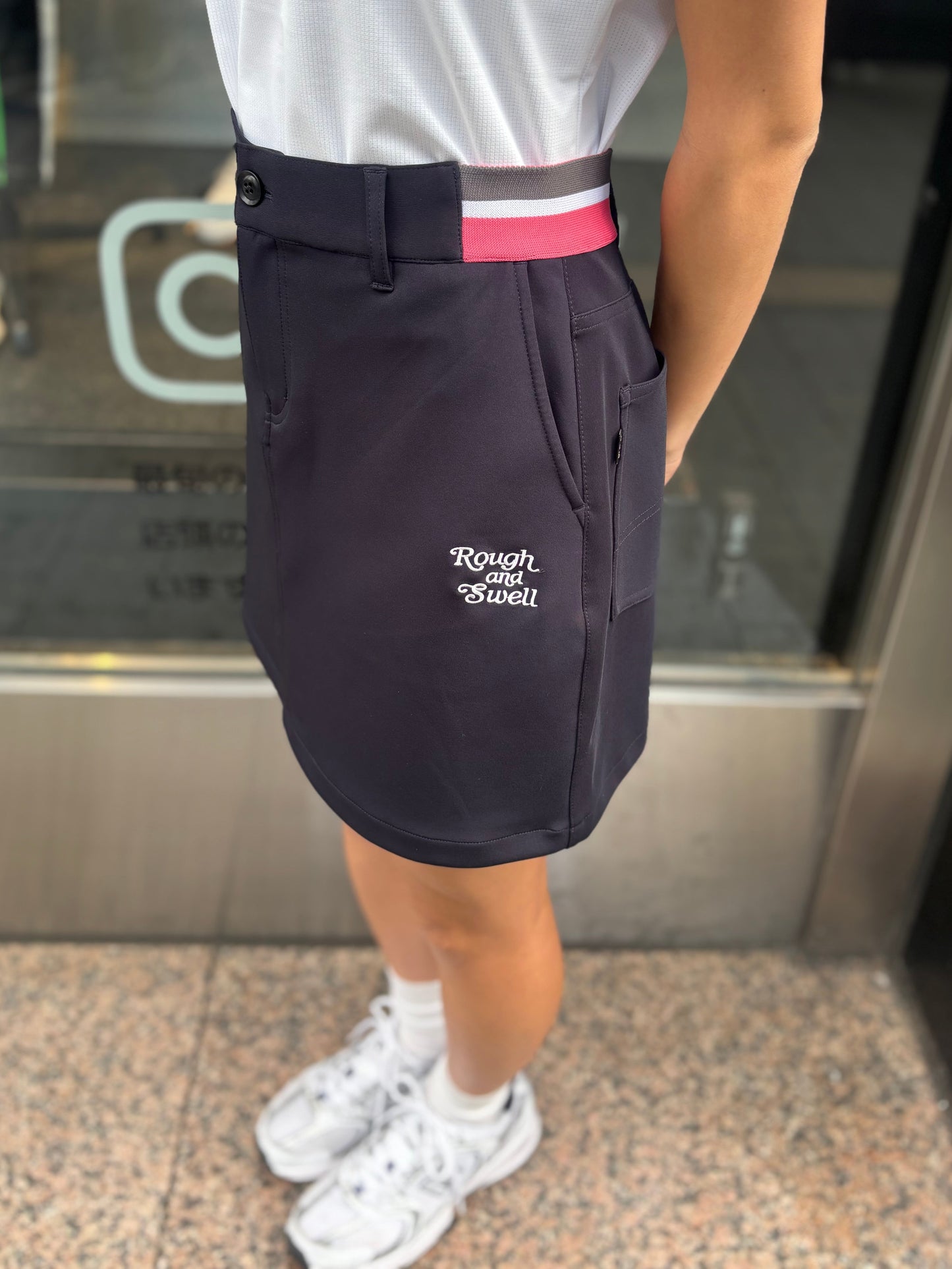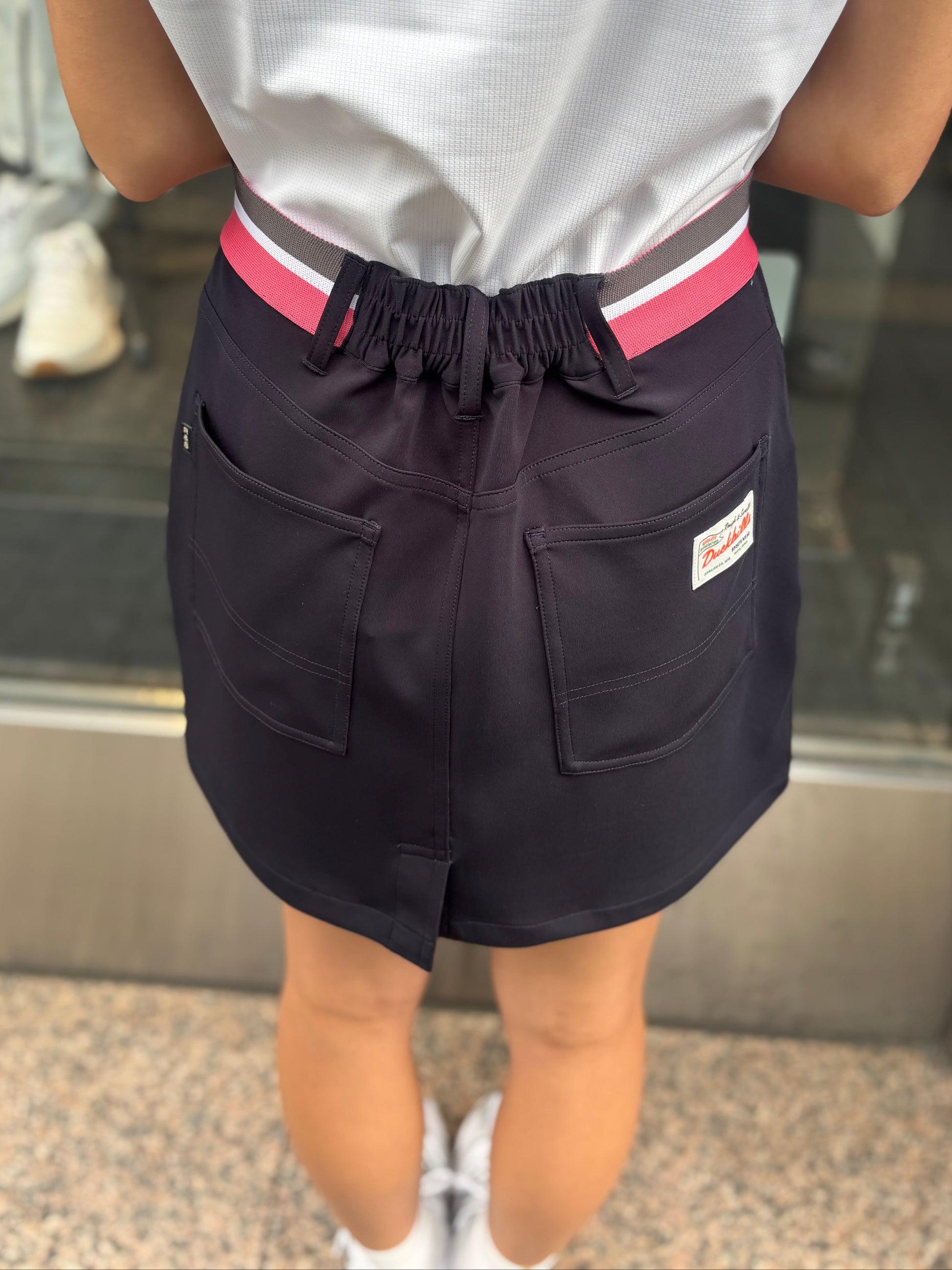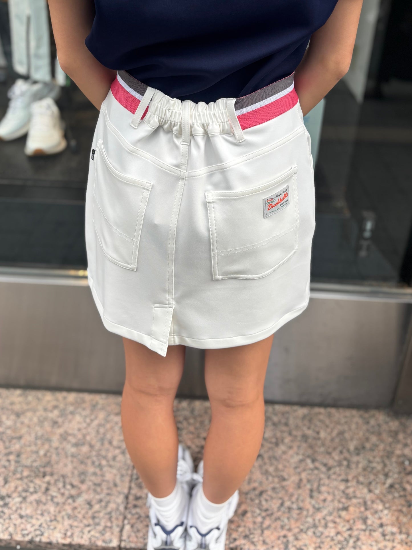 ウエストの配色ニットが効いたスカートはバックにゴムシャーリングが入って、フィット性が高くラクチンな着心地!