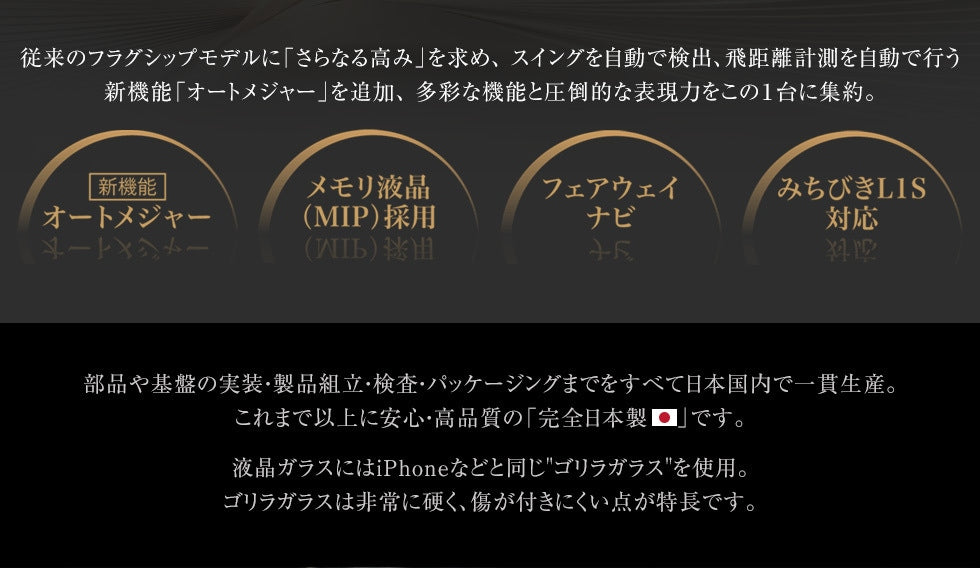 従来のフラグシップモデルに「さらなる高み」を求め、 スイングを自動で検出、飛距離計測を自動で行う新機能「オートメジャー」を追加、 多彩な機能と圧倒的な表現力をこの1台に集約。