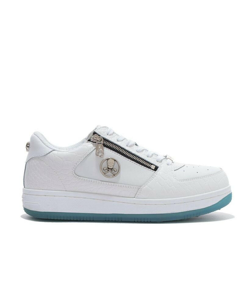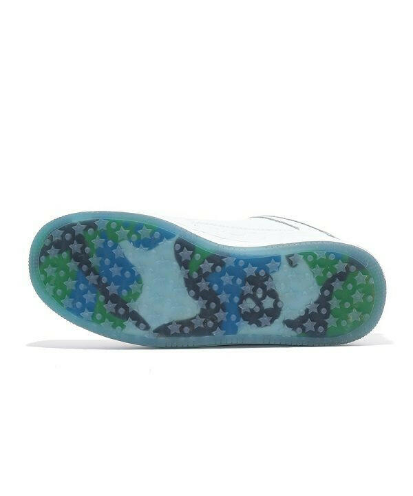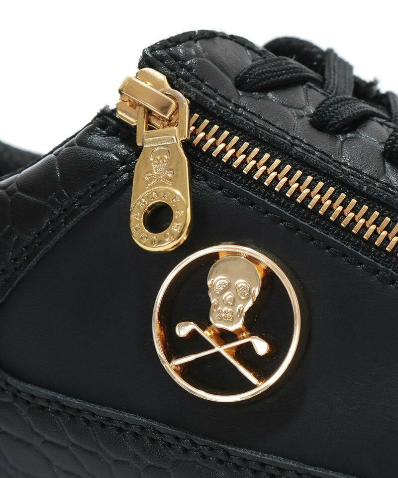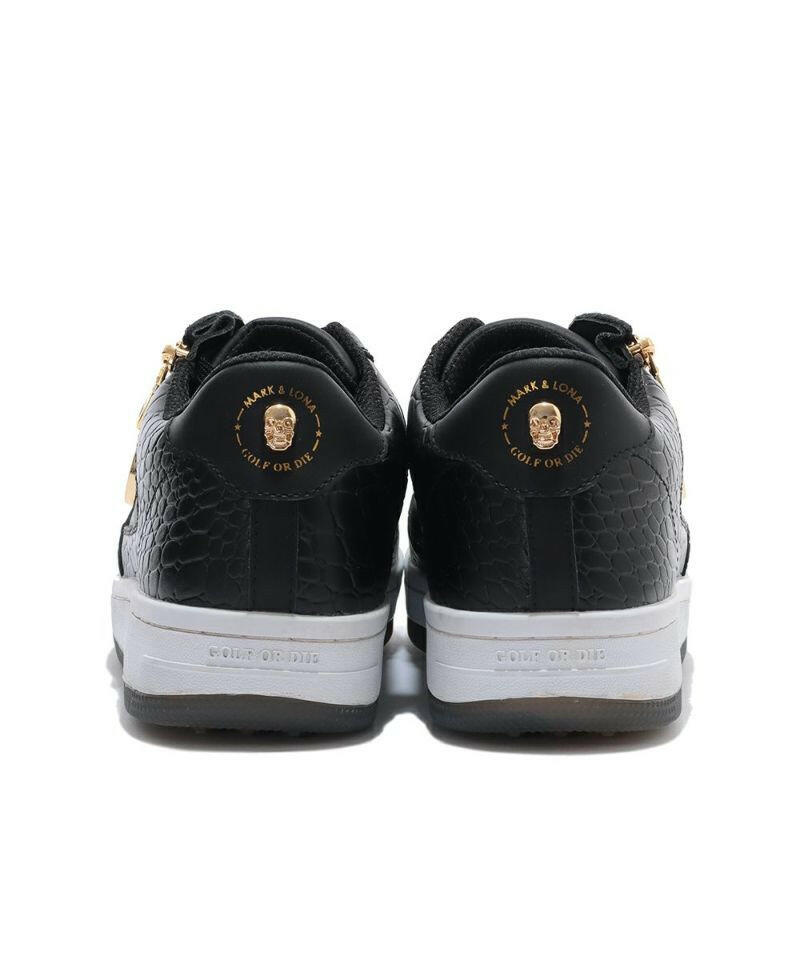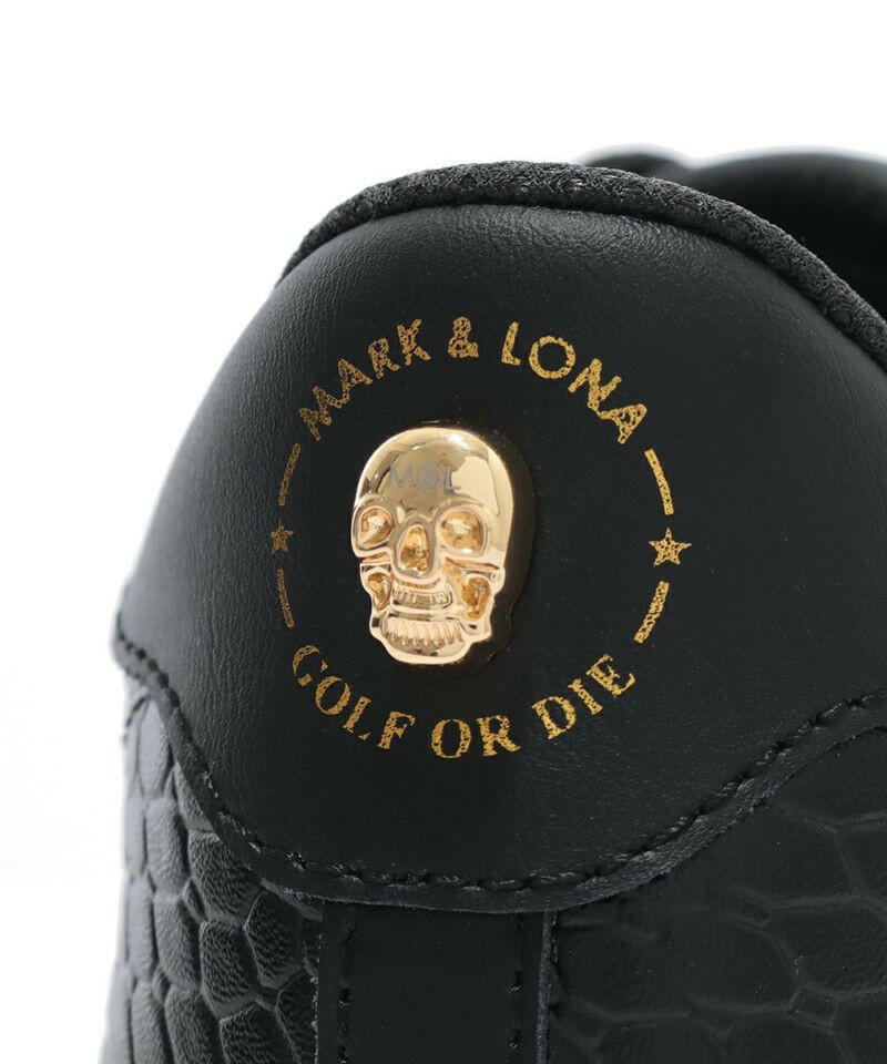 MARK & LONAらしいデザイン性の高さと機能性を兼ね備えた、ローカットタイプのスパイクレススニーカー。アッパー素材にマットスムースな牛革、セミグロスのクロコダイル型押し牛革を使用。サイドには鏡面仕上げのサークルスカルメタルバッジ、バックにはスカルスタッズ、シューレースに"GOLF OR DIE"のメタルシューレースチャームを配し、シンプルな機能美によって高級感と存在感のある仕上がりになっています。ソールにはオリジナルのクリアアウトソールを採用。さまざまな凹凸をつけた星型スパイクがしっかりと芝を捉え、あらゆるコンディションのゴルフコースで機能的にプレイを助けます。そのクリアソールから透けて見えるのは、MARK & LONAを代表するスカルカモフラージュ。シンプルなアッパーとコントラストのあるポップな配色が、ショットの後や歩く際に見え隠れします。また、ミッドソールにもボックスロゴ入りです。