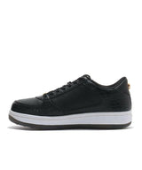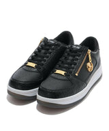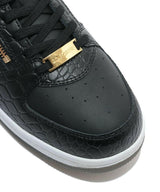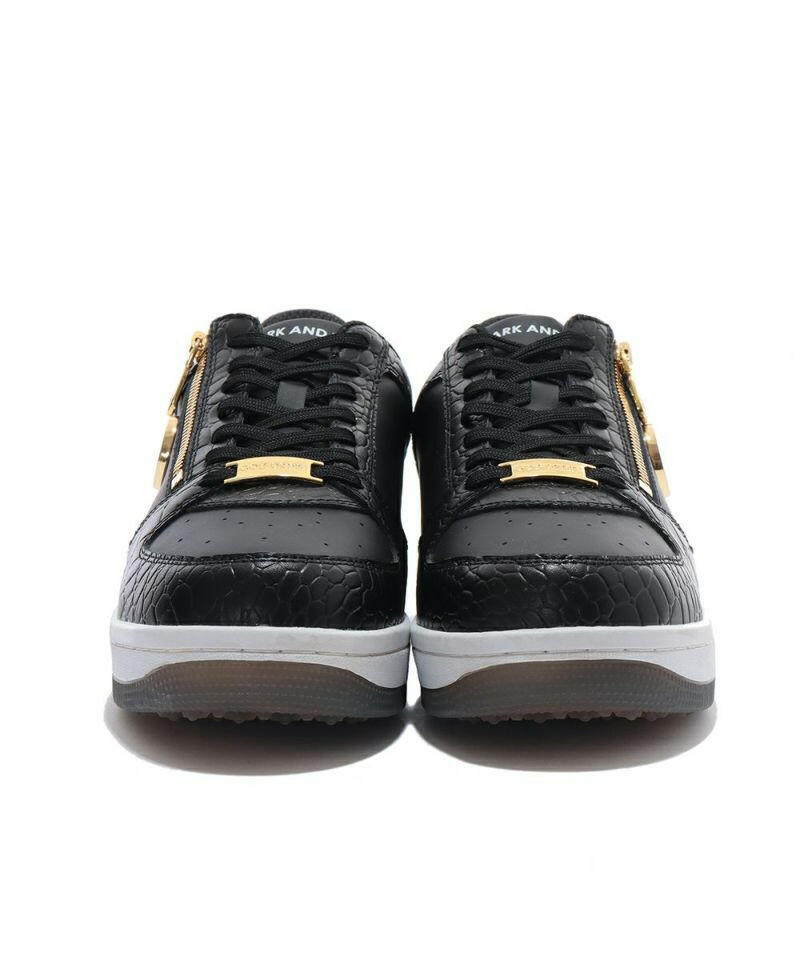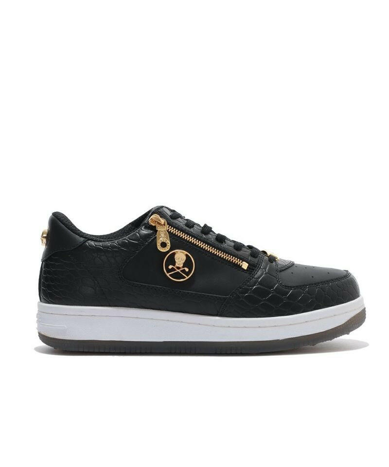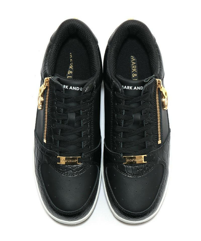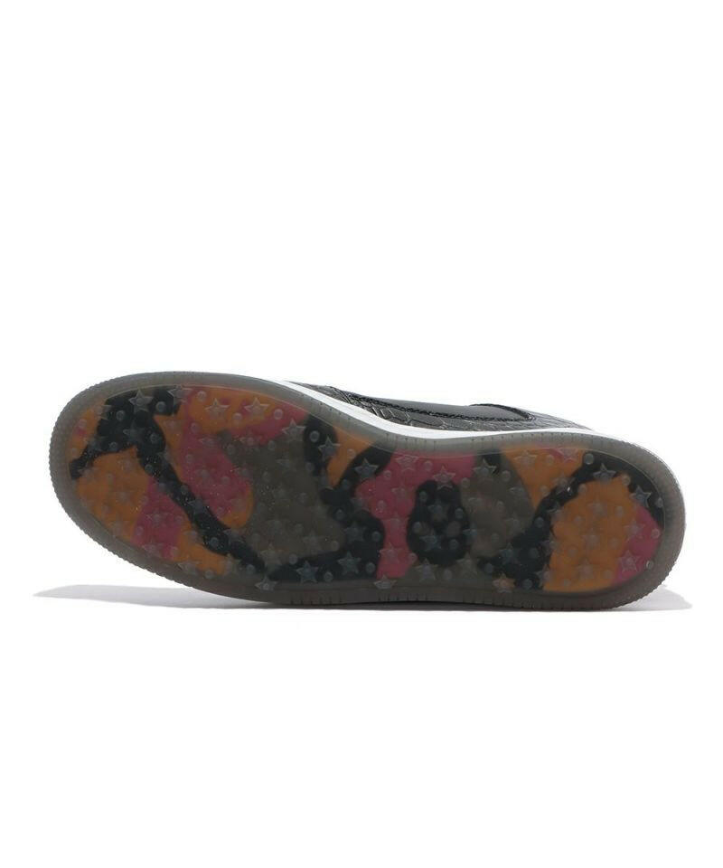 MARK & LONAらしいデザイン性の高さと機能性を兼ね備えた、ローカットタイプのスパイクレススニーカー。アッパー素材にマットスムースな牛革、セミグロスのクロコダイル型押し牛革を使用。サイドには鏡面仕上げのサークルスカルメタルバッジ、バックにはスカルスタッズ、シューレースに"GOLF OR DIE"のメタルシューレースチャームを配し、シンプルな機能美によって高級感と存在感のある仕上がりになっています。ソールにはオリジナルのクリアアウトソールを採用。さまざまな凹凸をつけた星型スパイクがしっかりと芝を捉え、あらゆるコンディションのゴルフコースで機能的にプレイを助けます。そのクリアソールから透けて見えるのは、MARK & LONAを代表するスカルカモフラージュ。シンプルなアッパーとコントラストのあるポップな配色が、ショットの後や歩く際に見え隠れします。また、ミッドソールにもボックスロゴ入りです。