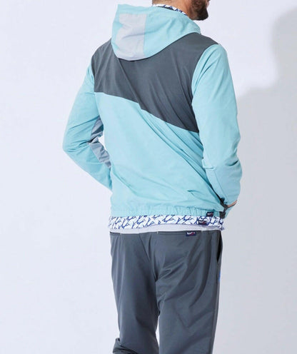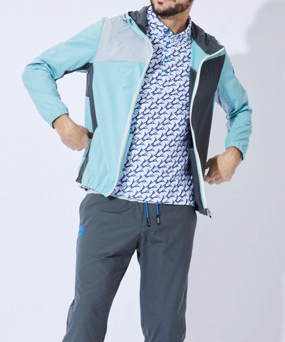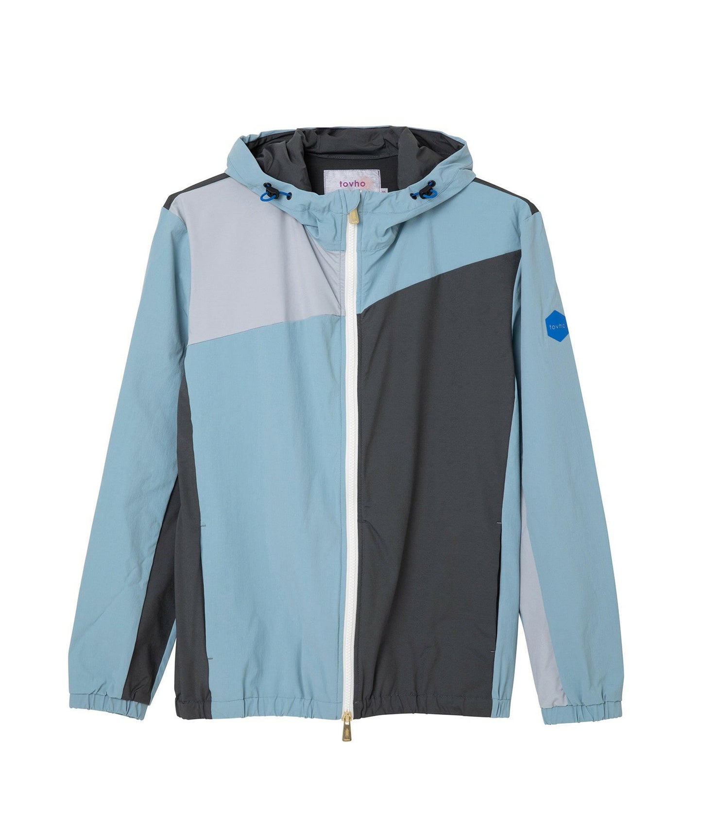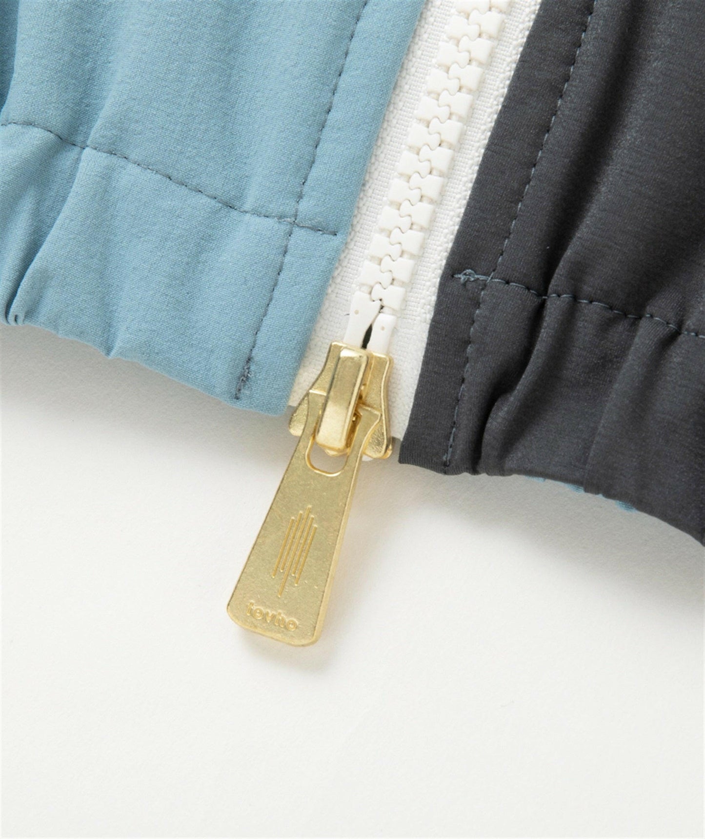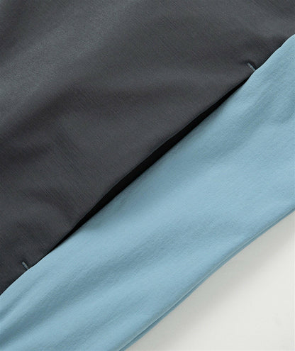 特殊編み機で仕上げられており、繊細な光沢感とジャージとは思えない表面感、さらに着用時の軽量感はこの素材ならではです。さらには撥水機能も完備しているため様々なシーンで着用できます。アシメトリーに配置されたカッティングデザインもポイントの1つです。