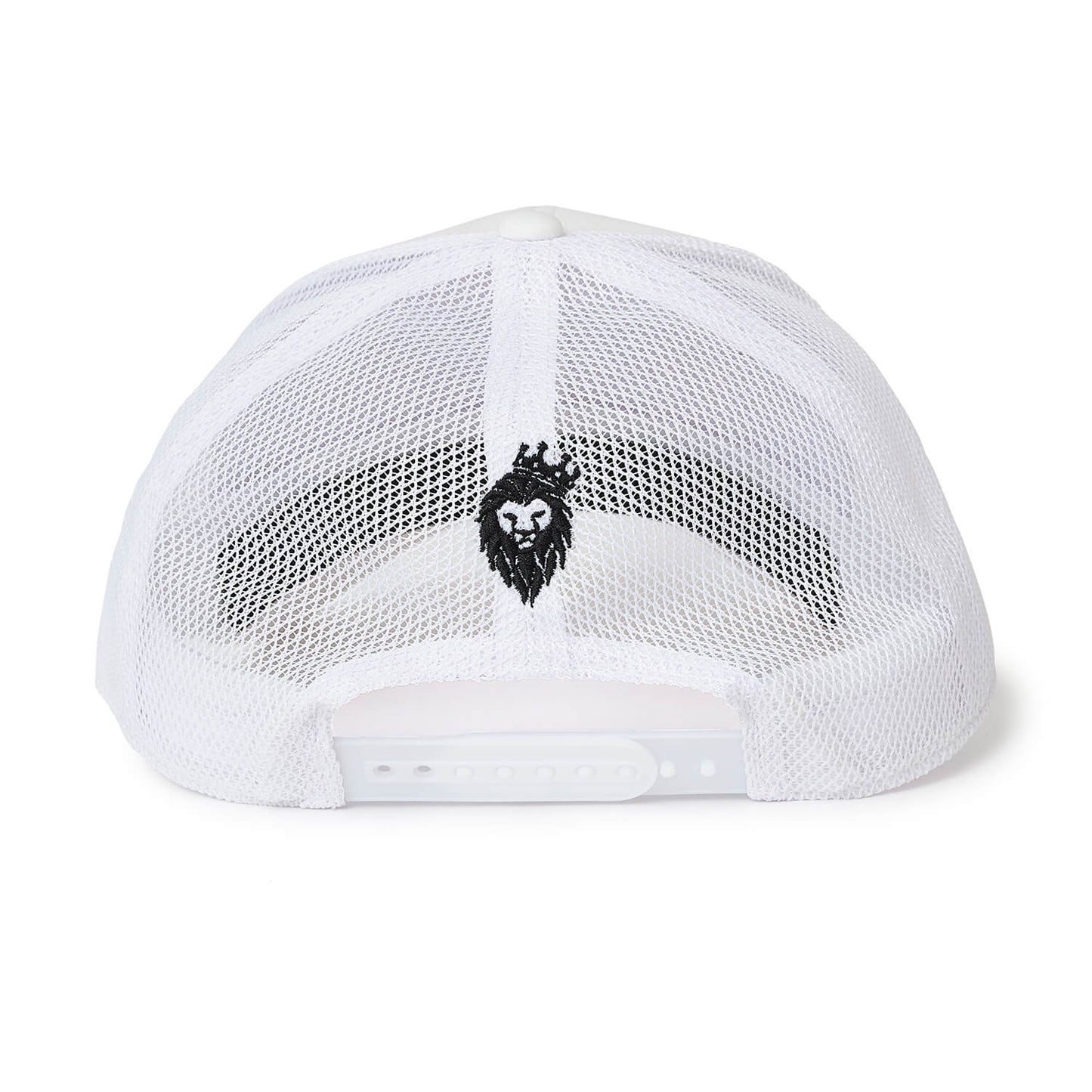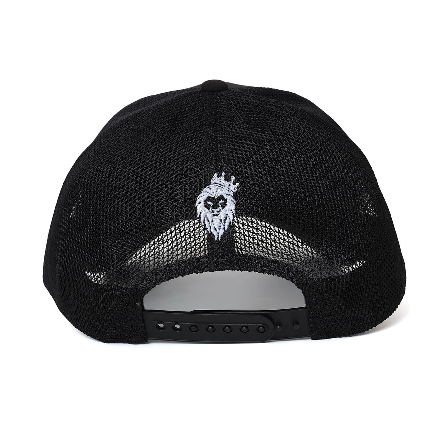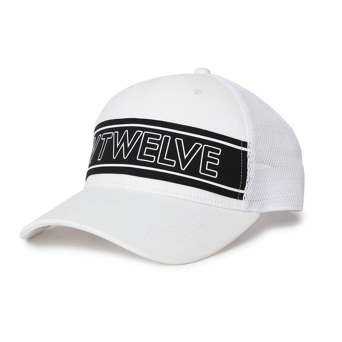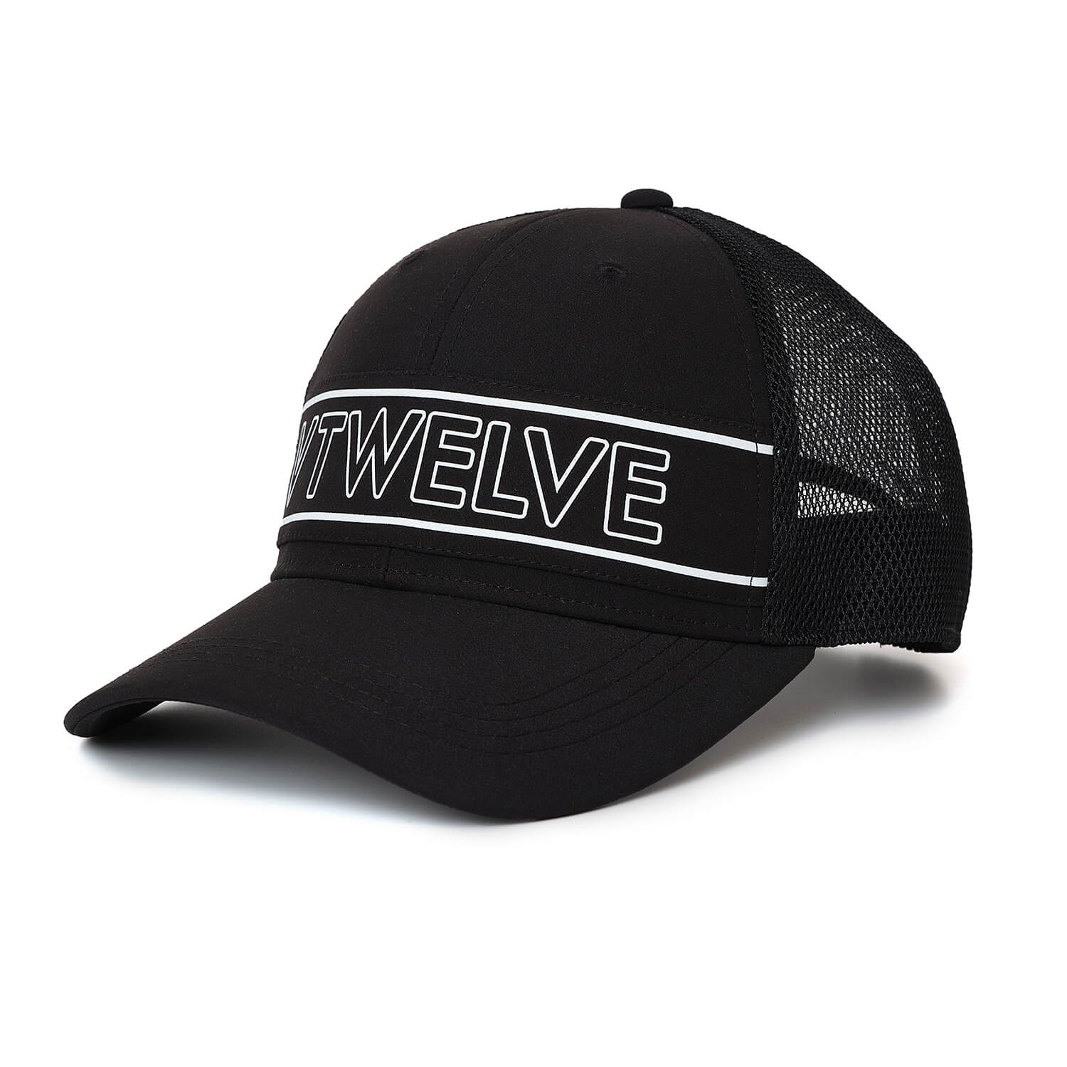 ロゴをプリントしたテープを配置したメッシュキャップ。